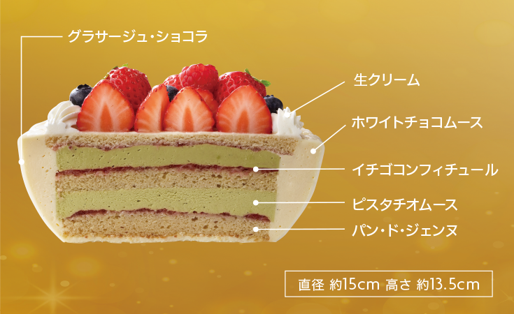 濃厚なピスタチオムースと苺のコンフィチュールをアーモンドの風味が際立つパン・ド・ジェンヌ生地にサンドし、ホワイトチョコムースで包み込んだ球体型の可愛らしいケーキです。